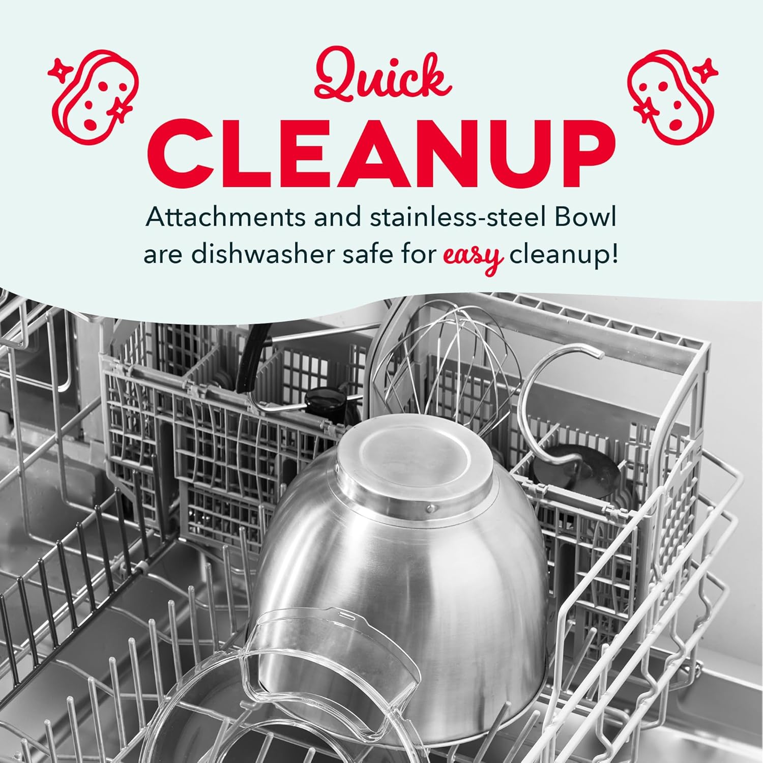 - EASY CLEANUP: Bowl & Attachments are dishwasher safe. Included Splash Guard for keeping the counter tidy!