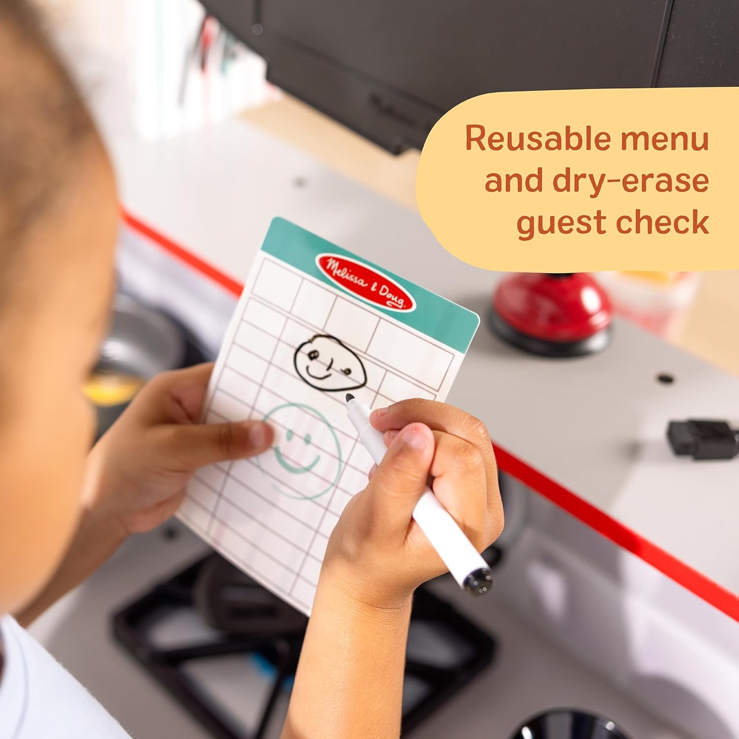 - 41-PIECE COMPLETE SET: Includes cookware, utensils, wooden play food, apron, menu, guest check, play money, napkin, and diner bell.